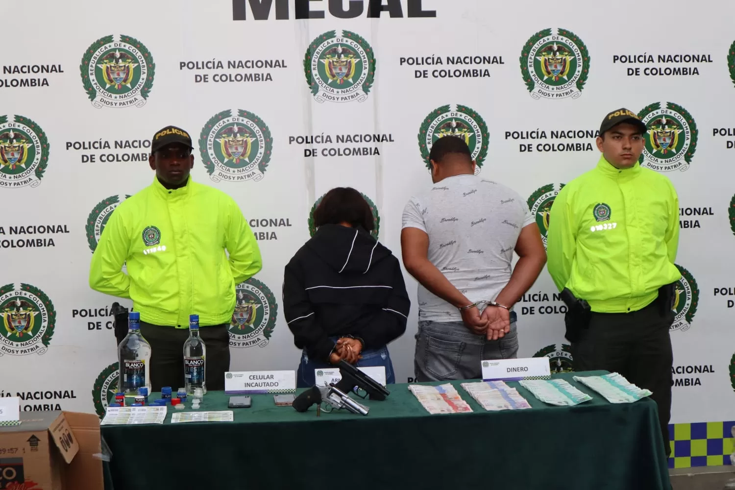 En el allanamiento del lugar, se incautaron dos armas de fuego, más de 160 litros de aguardiente adulterado, 23 millones de pesos en efectivo, estampillas, tapas, cajas, botellas y otros elementos relacionados con la producción de esta sustancia ilegal.