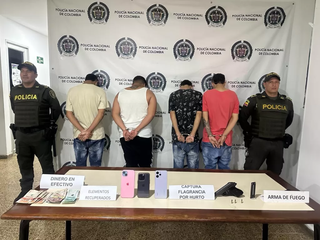 En otra acción operativa, unidades de vigilancia capturaron en flagrancia a tres hombres y aprehendieron a un adolescente de 17 años por el hurto a un local comercial en el sector de Pasoancho. Los delincuentes intimidaron a los clientes, sustrayendo celulares, joyas y dinero en efectivo. Todos los detenidos han sido puestos a disposición de la Fiscalía General de la Nación y de la especializada de menores, enfrentando cargos por hurto calificado y agravado.