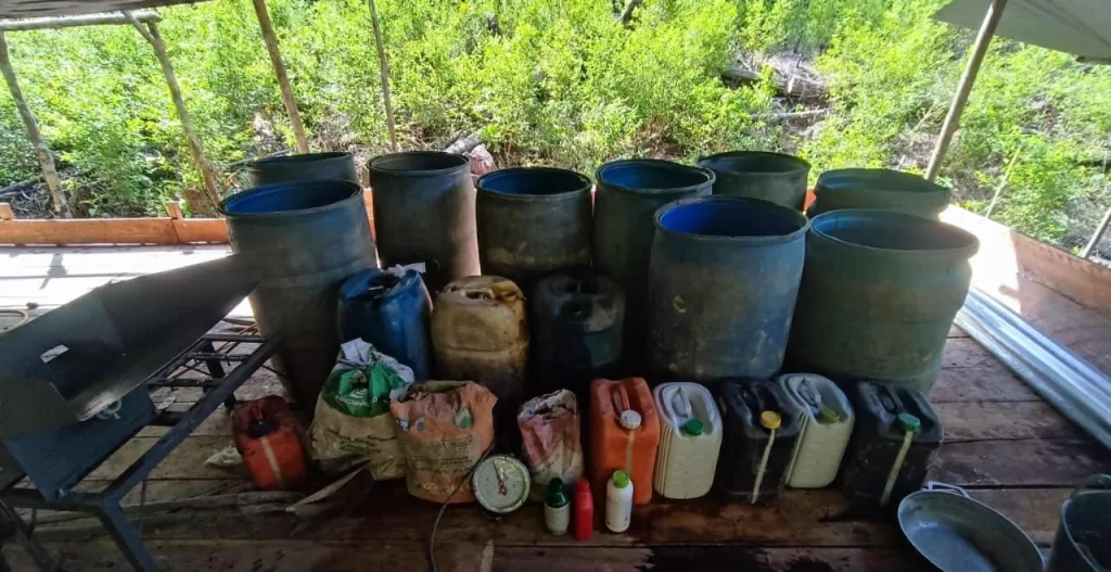 Además, en el municipio de Guapi, las tropas del Batallón Fluvial de Infantería de Marina No.42, en colaboración con el Ejército Nacional, descubrieron dos laboratorios artesanales con un total de 1.305 galones de insumos líquidos y 422 kilogramos de insumos sólidos destinados al procesamiento de pasta base de coca.