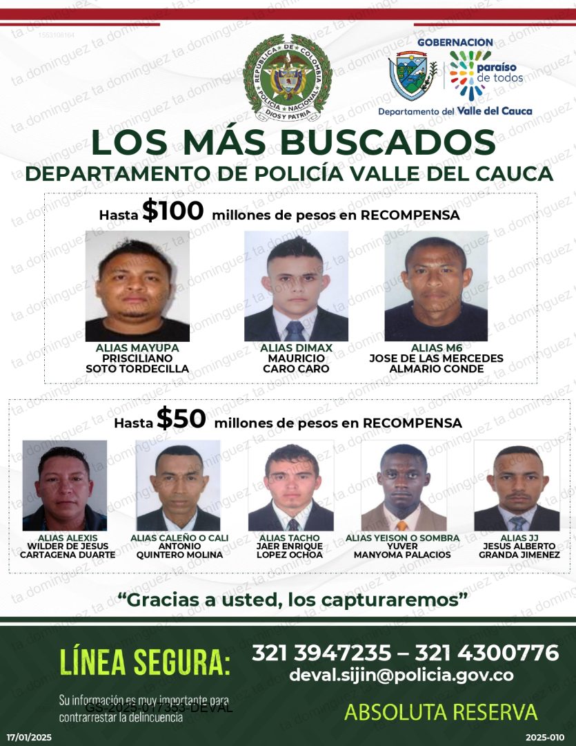 Por su parte, la Gobernadora del Valle del Cauca hizo un llamado a la colaboración ciudadana al revelar que las ocho personas más buscadas por las autoridades judiciales en el departamento, quienes tienen orden de captura por diversos delitos, forman parte de una lista crítica para la seguridad en la región. Entre ellos se encuentran: Prisciliano Soto Tordecilla alias ‘Mayupa’, Mauricio Caro Caro alias ‘Dimax’, y José de las Mercedes Almario Conde alias ‘M6’, por quienes se ofrece una recompensa de hasta 100 millones de pesos por información que conduzca a su captura. Además, se ofrece una recompensa de hasta 50 millones de pesos por datos sobre Wilder de Jesús Cartagena Duarte alias ‘Alexis’, Antonio Quintero Molina alias ‘Caleño o Cali’, Jaer Enrique López Ochoa alias ‘Tacho’, Yuver Manyoma alias ‘Yeison o Sombra’ y Jesús Granda Jiménez alias ‘JJ’.