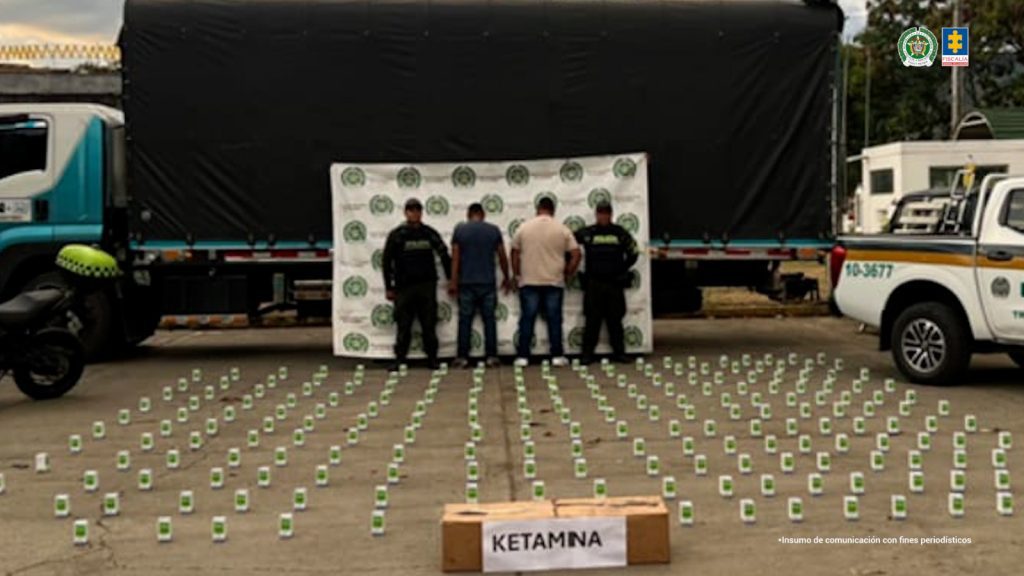 La Policía Nacional capturó en flagrancia a José Luis Vallejos Figueroa y Jhonny Fernando Mora Cuasialpud en el corregimiento Presidente, jurisdicción de Buga (Valle del Cauca). Durante un operativo de inspección de rutina, las autoridades encontraron 215 frascos de ketamina, con 100 gramos cada uno, escondidos entre el cargamento de papa.