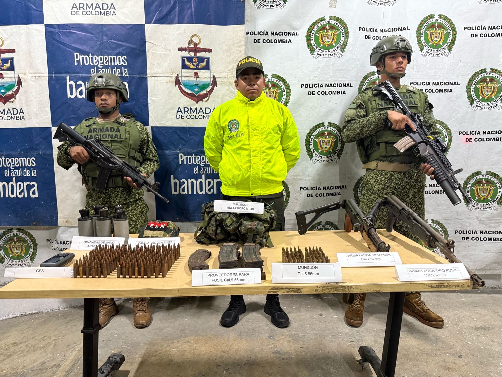 Durante el procedimiento, se encontraron dos fusiles, uno calibre 5.56 mm y otro 7.62 mm, además de 1.138 cartuchos de diferentes calibres, cinco granadas artesanales, proveedores para fusil, equipos de telecomunicaciones y prendas de uso exclusivo de las Fuerzas Militares. La ubicación de este arsenal supone un golpe a las estructuras criminales que operan en el área y utilizan este tipo de armamento para sus actividades ilegales.