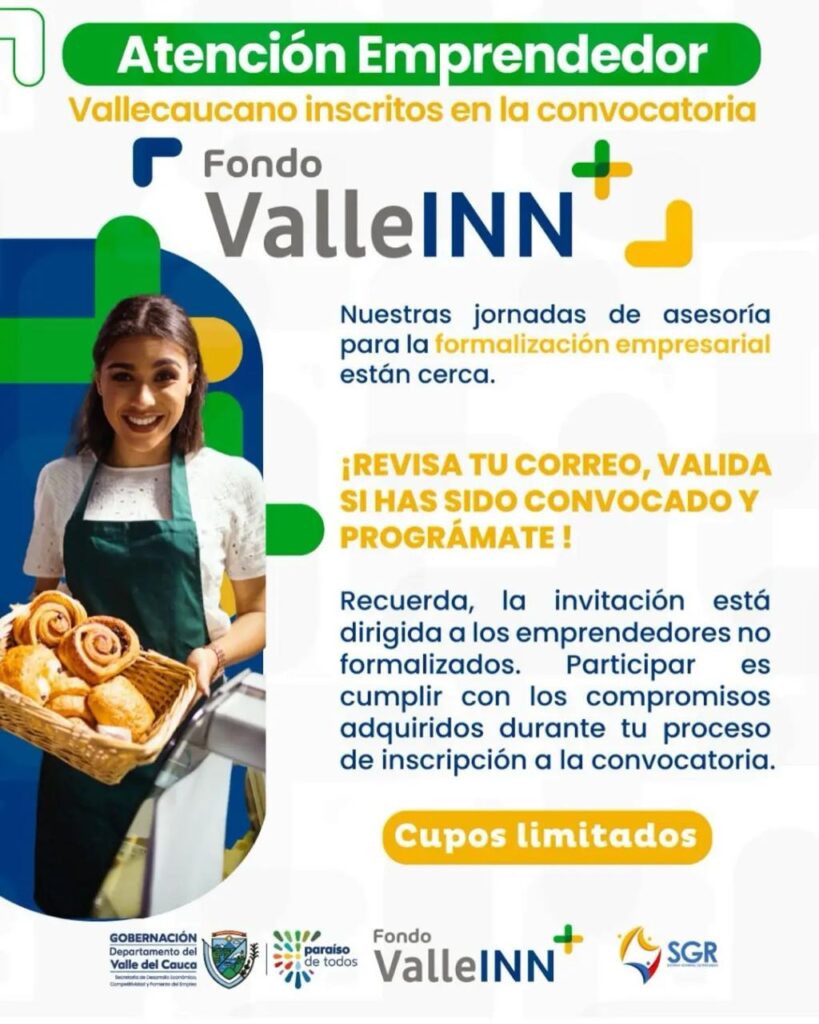 Con el cierre de la convocatoria del Fondo ValleINN+, se registró la inscripción de 3.196 emprendedores de los municipios de Cartago, Buga, Tuluá, Palmira y Buenaventura. Este programa tiene como objetivo fortalecer las unidades de negocio a través de la entrega de capital en equipos, maquinaria e insumos, además de asesorías personalizadas y formación estratégica en gestión empresarial.