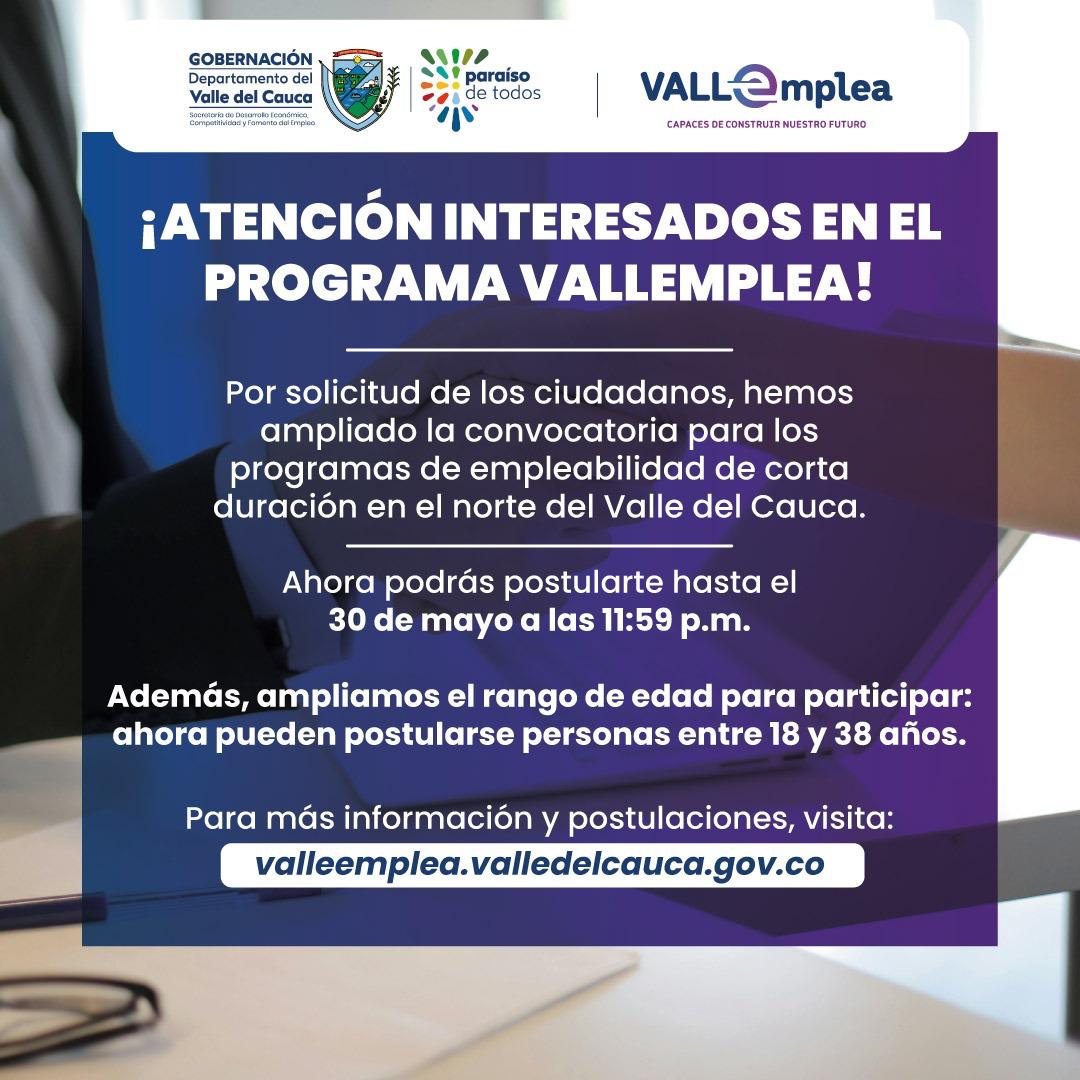 Para obtener más información y realizar las inscripciones, los interesados pueden acceder al sitio web oficial del programa VALLEmplea o completar el formulario de inscripción en este enlace.