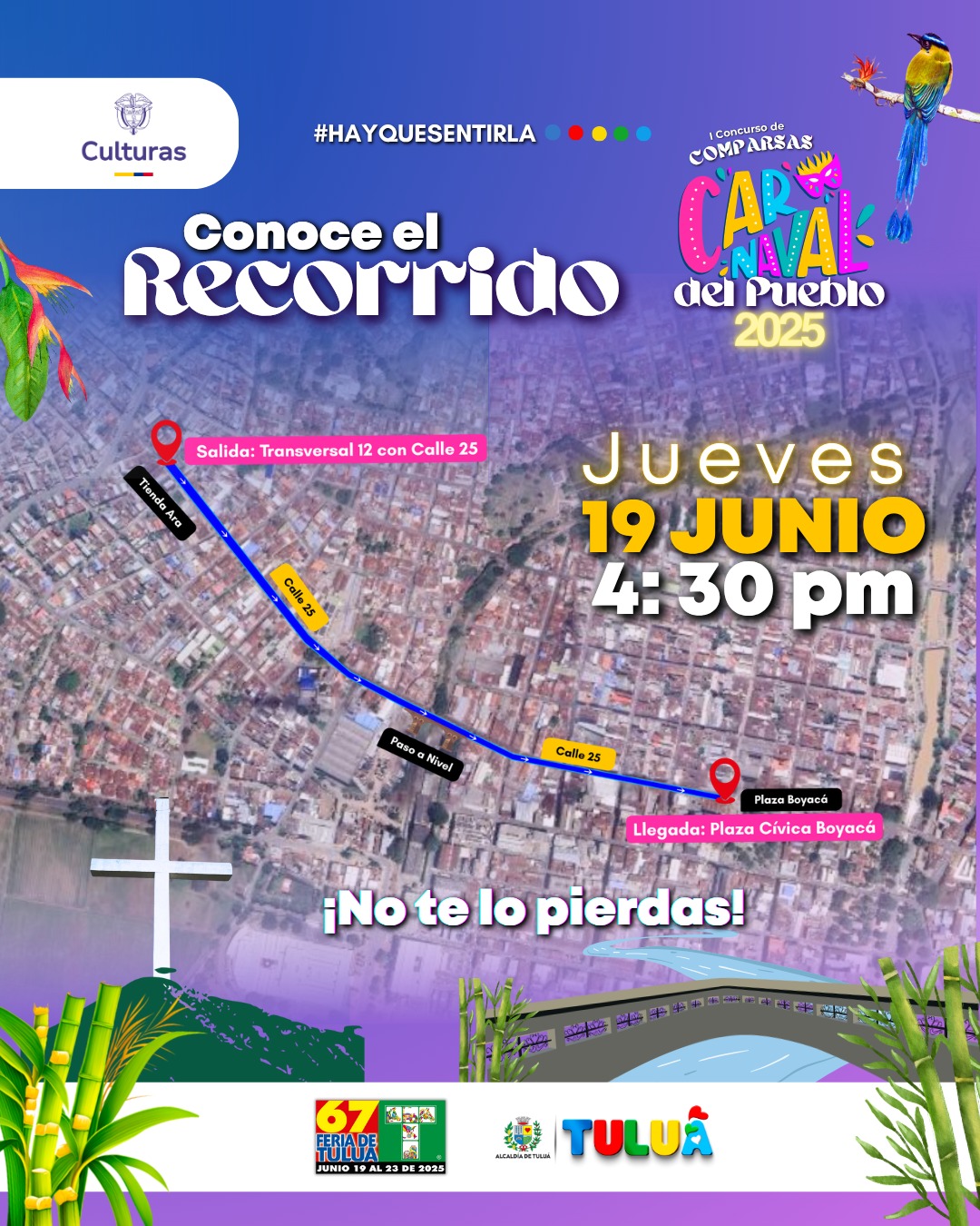 El próximo jueves 19 de junio, en el marco de la Sexagésima Séptima Feria, Tuluá contará con el tradicional desfile de comparsas “Carnaval del Pueblo”, un evento que reunirá a más de 1.200 artistas en escena y que se ha consolidado como una de las expresiones culturales más representativas de la ciudad.