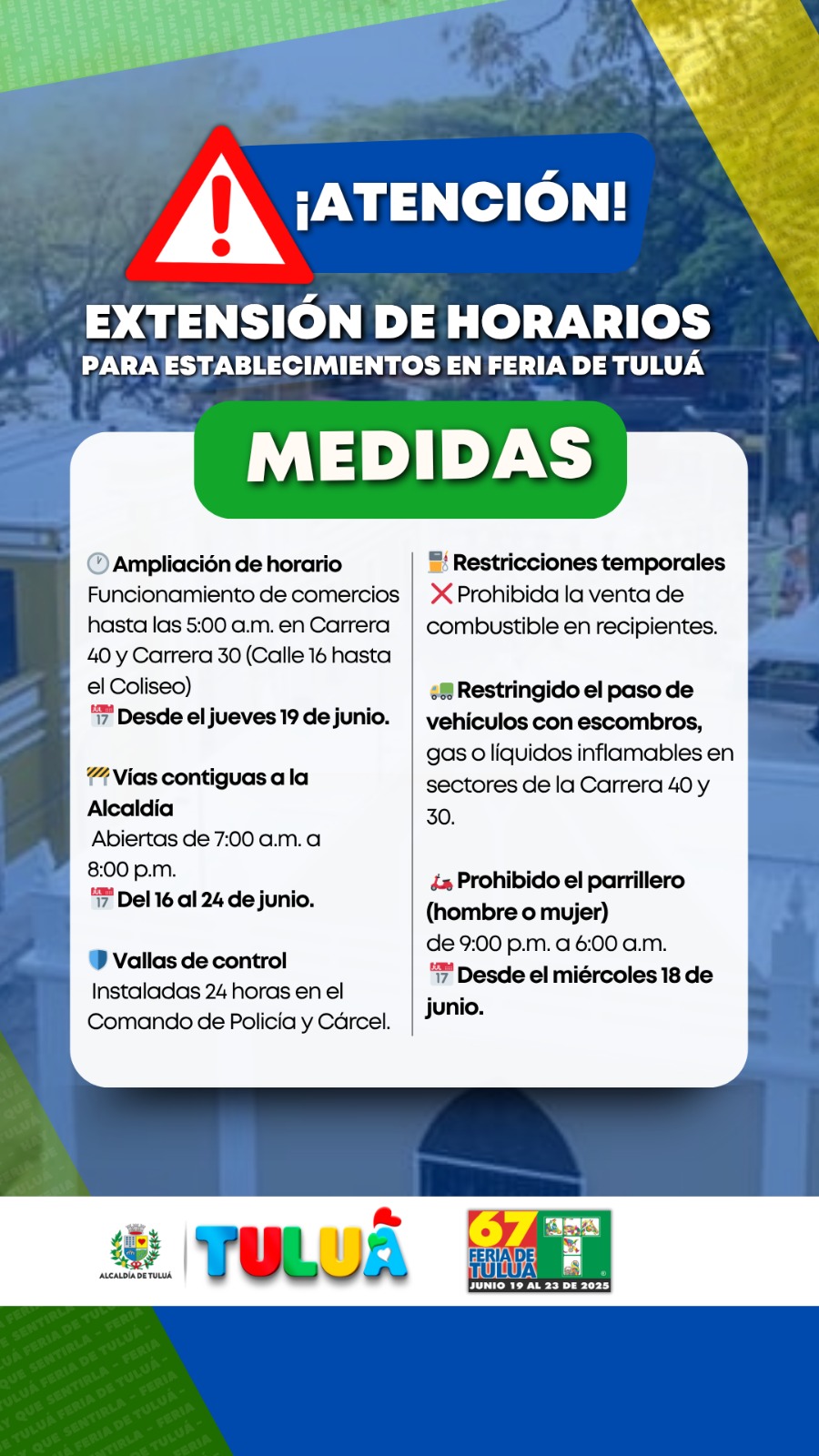 Durante el desarrollo de la Feria de Tuluá 2025, el municipio implementó una serie de medidas especiales en materia de movilidad, comercio y seguridad. Las disposiciones, que estarán vigentes hasta el próximo 24 de junio, buscan facilitar el desarrollo de las actividades programadas, garantizar el orden público y mitigar riesgos en zonas de alta afluencia.