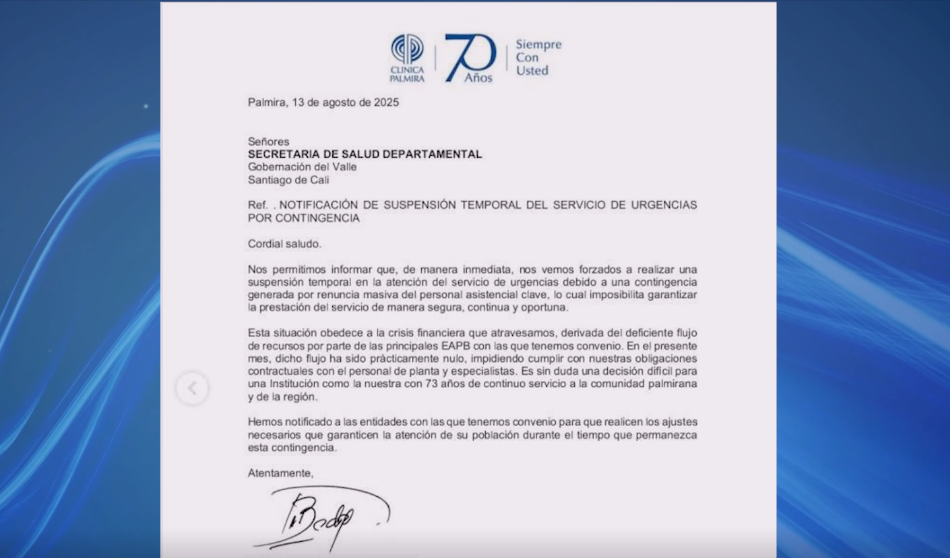 Las instituciones de salud del Valle del Cauca permanecen en alerta amarilla tras el cierre temporal del servicio de urgencias en Palmira, decisión tomada en medio de una crisis financiera que golpea a la red hospitalaria del departamento.