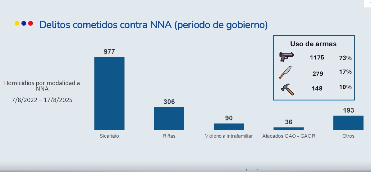 Según el director de la institución, general Carlos Fernando Triana Beltrán, en este periodo se registraron 977 casos de sicariato contra menores, 306 homicidios en riñas y 90 ataques cometidos por grupos armados organizados. El 73% de estos hechos ocurrieron con armas de fuego.
