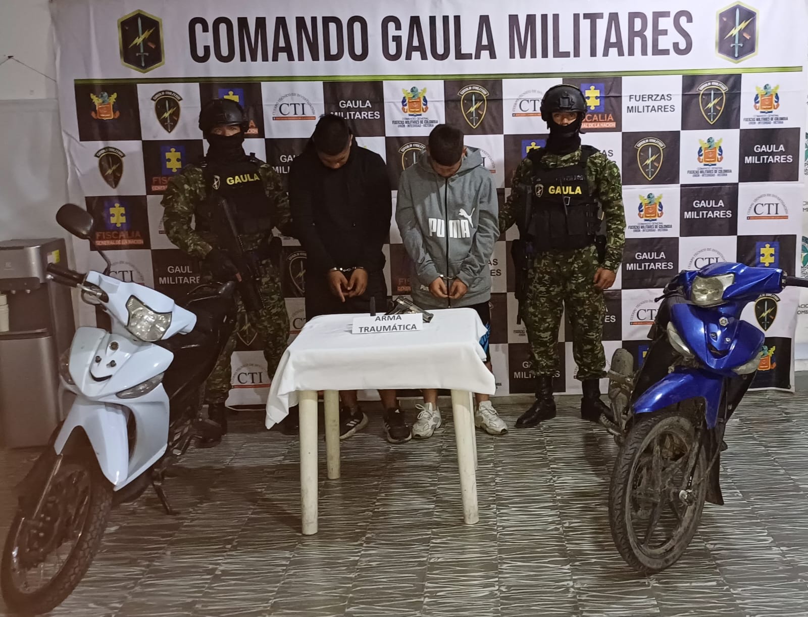 Otros dos individuos emprendieron la huida, pero fueron capturados tras la implementación de cierres viales coordinados con la Policía Nacional. En la operación fueron incautadas un arma corta y dos motocicletas, las cuales, junto con los detenidos, quedaron a disposición de las autoridades competentes.