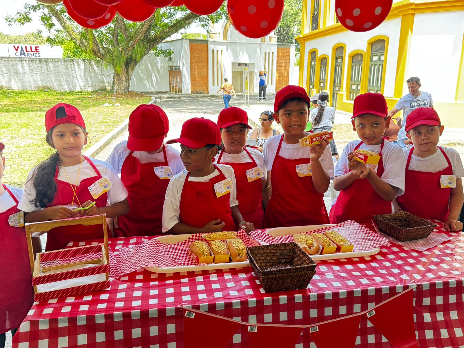 Durante la feria empresarial del Colegio del Niño Jesús, un grupo de estudiantes presentó el emprendimiento Mini Perros Bomba, una propuesta gastronómica que llamó la atención de los asistentes por su sabor y calidad.