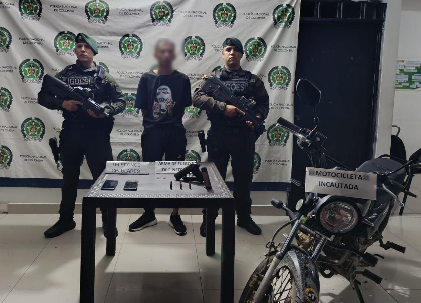 También le fueron incautados dos teléfonos celulares y una motocicleta. El capturado no presentó documentos que acreditaran la tenencia o porte legal del arma, por lo que fue informado de sus derechos y puesto a disposición de la Fiscalía General de la Nación – URI Roldanillo, en cumplimiento del artículo 365 del Código Penal.