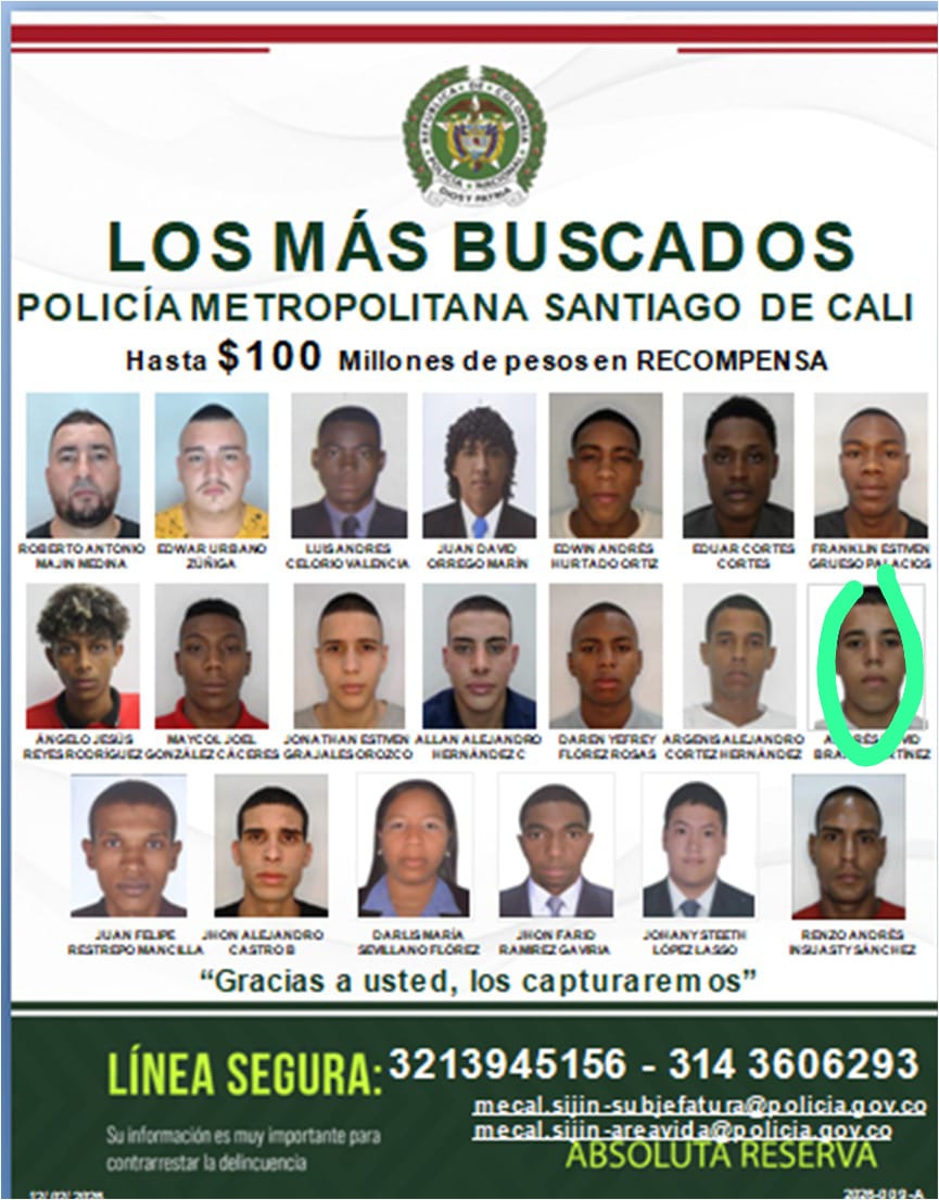 En el cartel también figuran otras 19 personas que continúan siendo buscadas, entre ellas Renzo Andrés Insuasty Sánchez, investigado por el homicidio de una mujer, y Darlis María Sevillano Flores, vinculada a un doble homicidio y a un caso de lesiones con arma de fuego.